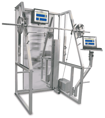 Monitored rehab Systems Free Functional Squat is the first upright squat machine to allow full functional movements (squat and bench press) while providing visual biofeedback to the user during the workout.