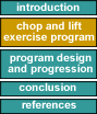 The Chop and Lift are multiplanar (three-plane) exercises which require diagonal and spiral motions of the arms, shoulders, trunk, hips, and legs. They should be performed in a standing position but can also be done while seated or half-kneeling to reinforce technique as needed. The standing position, the most advanced of the three, allows for a closed chain, neutral lumbar spine. The neutral spine position relies on muscular support and does not stress the joints of the spine. Since this is a midrange-of spinal motion, the ligaments and discs are not exposed to improper loading or unnecessary stress (3). A high/low weighted pulley system or elastic tubing is used as resistance for isotonic work. Medicine balls may be used for plyometric work when applicable. It is important to understand differences in power in regard to right and left sides, and to try to maintain a balance even if the sport or activity is dominant to one side. This can be identified with a simple medicine ball throw for functional testing. The chop and lift exercises photos shown depict the half-kneeling position. Table 1 shows analysis of the standing position. The chop incorporates (a) a pull action followed by a push action of the upper body; (b) stabilization of the trunk in three planes (flexion, rotation, and side-bending); and (c) weight transfer for leverage and dynamic balance. In the analysis of the chop, the subject faces the cable at approximately a 45° angle, with the left foot open in the stance and the lumbar spine in a neutral position. The lift incorporates (a) a pull action followed by a push action of the upper body; (b) stabilization of the trunk in three planes (extension, rotation, and side-bending); and (c) weight transfer for leverage and dynamic balance. In the analysis of the lift, the subject faces away from the cable at approximately a 45° angle, with the left foot open in the stance and the lumbar spine in a neutral position.